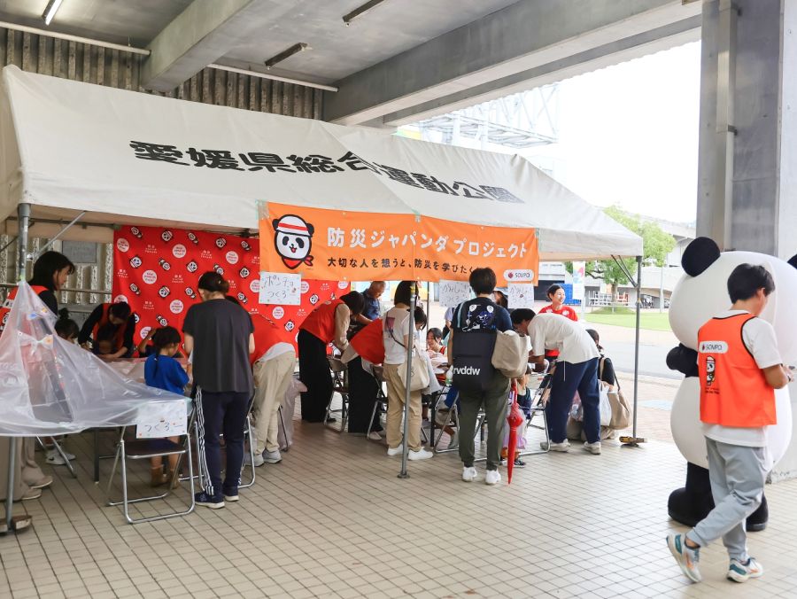 スポーツで汗を流した後は、会場に設置された「防災ジャパンダ」ブースが大人気!ここでは、子どもたちが「ポンチョづくり」と「紙食器づくり」に挑戦しました。