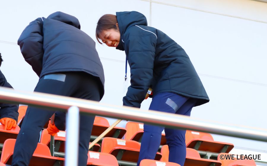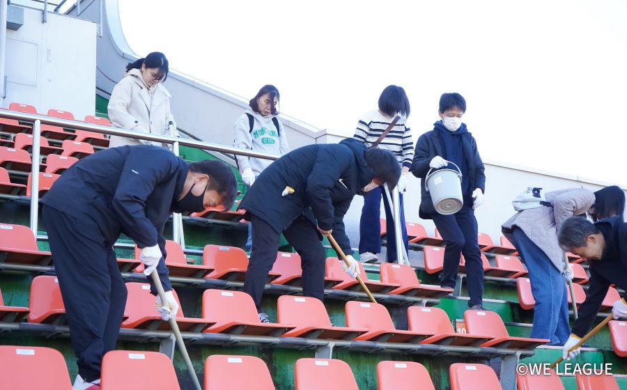 清掃活動では、選手やクラブスタッフと共に、デッキブラシや雑巾を手にスタジアムのスタンドの座席、階段、通路など隅々まで丁寧に磨き上げました。選手やサポーターが日頃利用する大切なホームスタジアムが、参加者全員の熱意によってみるみるうちに輝きを取り戻していきました。