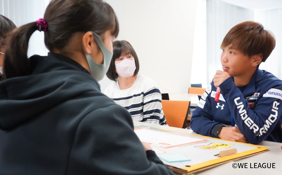 地域コミュニティにおけるスタジアムの未来を共に考えるワークショップも行われ、「どのようなスタジアムだったらよいか」「スタジアムのおすすめポイント」といったテーマのもと、選手、パートナー企業など、多様な立場の人々が一堂に会して活発な意見交換が行われました。「選手全員とハイタッチ」「ポイントを集めると景品がもらえる」といった、夢のあるアイデアからすぐに実現できそうなものまで、多くの自由な発想が次々に飛び出しました。